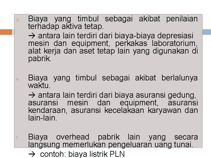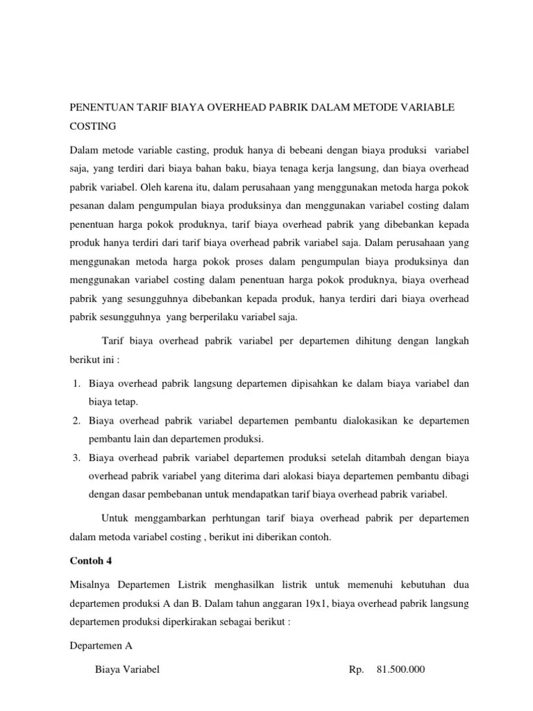 20.02.2021 · sementara yang termasuk biaya overhead antara lain pajak, biaya asuransi, biaya atk, biaya sewa, biaya keamanan, dan sebagainya. Pengertian biaya variabel dan biaya tetap Biaya overhead pabrik disebut juga biaya konversi ( conversion cost ), yaitu biaya untuk mengkonversi (mengubah) bahan baku menjadi produk jadi. Besar biaya overhead pabrik tidak … Biaya overhead dibedakan menjadi 3 jenis, yaitu biaya overhead tetap, variabel, dan semi variabel.
